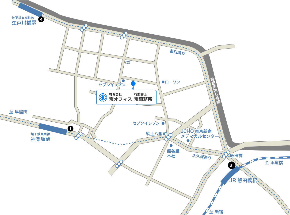 JR飯田橋駅東口、東京メトロ飯田橋駅B1出口より徒歩約11分